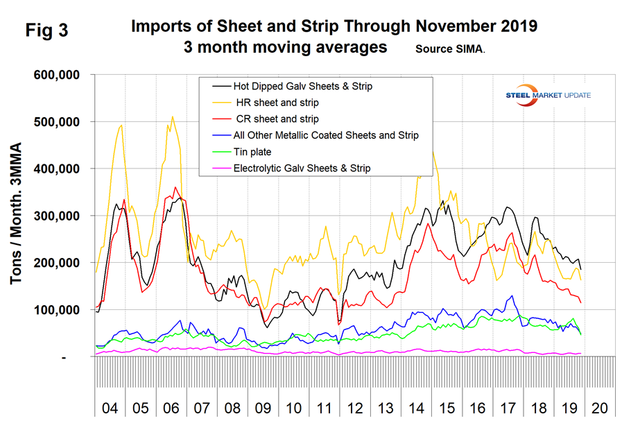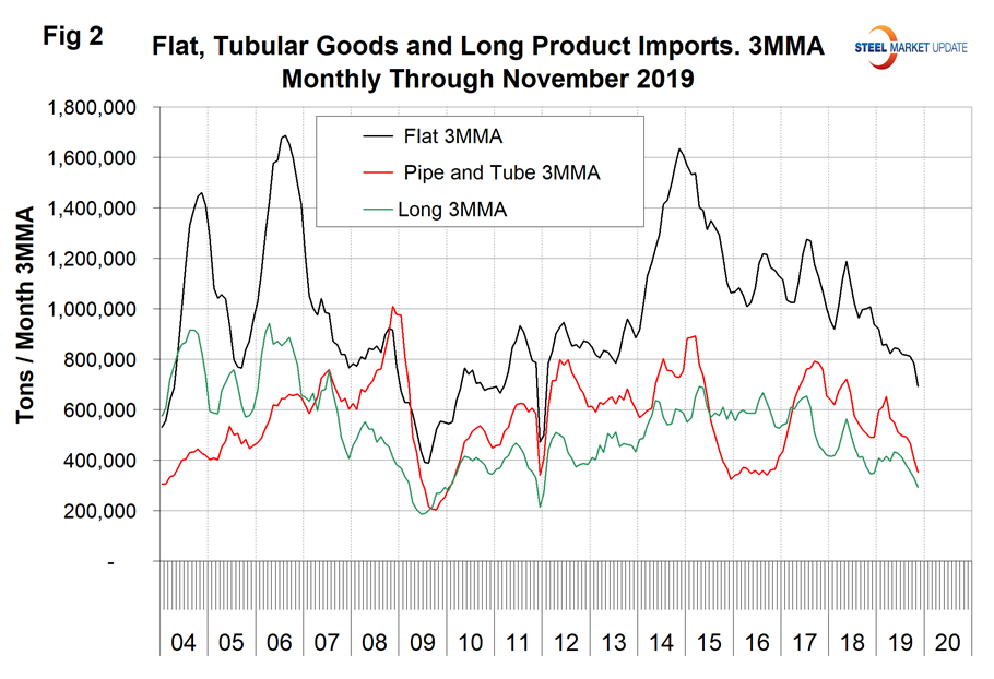 Figure 2 summarizes the import volume of flat rolled, tubular and long products since 2004 on a 3MMA basis. All three have been trending down since mid-2017.