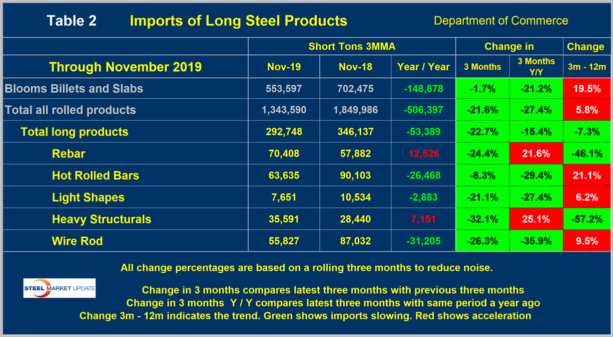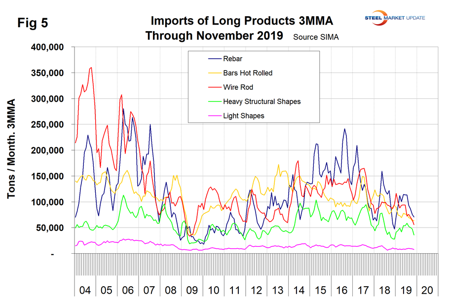 Table 2 shows the same analysis for long products where the year-over-year volume was down by 15.4 percent in total. All products except rebar and heavy structurals were down year over year. Figure 5 shows the history of long product imports.
