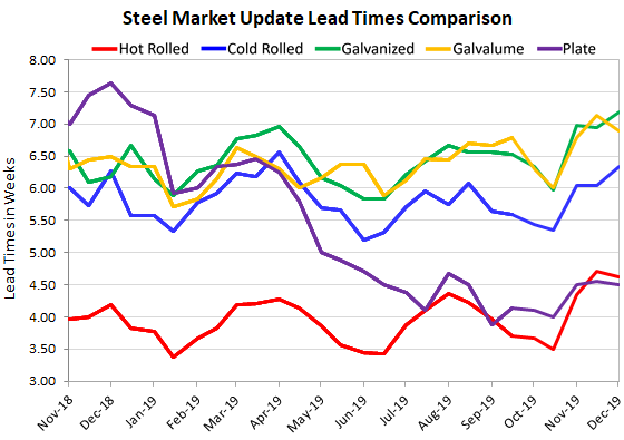 Reporting the change in average lead times since mid-November, hot rolled is now at 4.63 weeks, down from 4.70 weeks. The average lead time for Galvalume is down to 6.89 weeks from 7.13 weeks. Lead times for spot orders of plate steel are down to 4.50 weeks from 4.56 weeks. Moving the opposite direction was cold rolled, now up to 6.33 weeks from 6.04 weeks, and galvanized, up to 7.18 weeks from 6.94 weeks. Except for plate, lead times for all steel products are still longer than they were at this time last year.