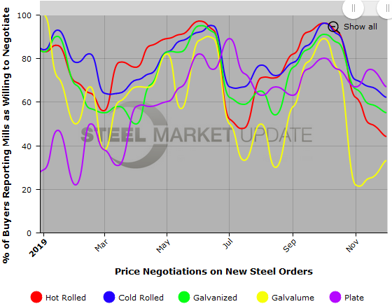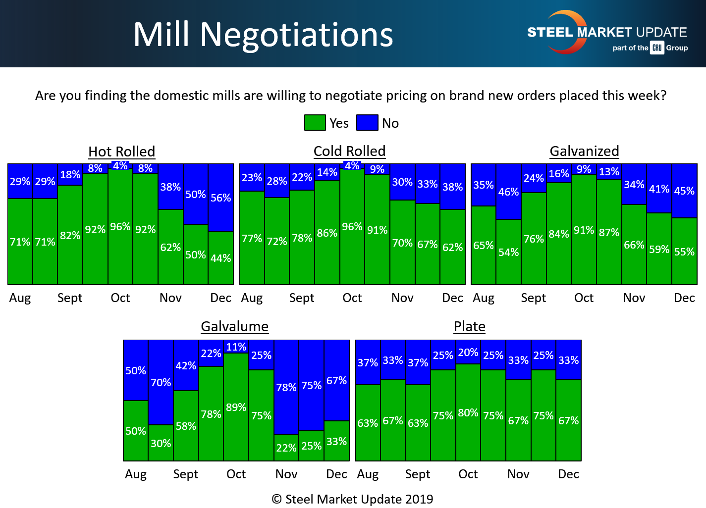 Likewise, the majority of galvanized steel buyers (55 percent) reported the mills are still flexible when it comes to pricing galv orders, but down from 66 percent this time last month. Galvalume is the opposite, however, with the majority (67 percent) reporting mills unwilling to deal.