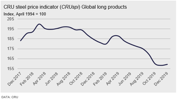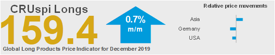Steel longs prices have changed direction this month with rises now observed in many markets. Although underlying demand has improved in some regions it is still weak elsewhere. Buyers in many regions have restocked in the last month while producers exposed to scrap and billet have started to pass on higher costs, aided by tighter supply. Overall, the Global Long Products Price Indicator (CRUspi Longs) increased by +0.7 percent m/m to 159.4 in December 2019.