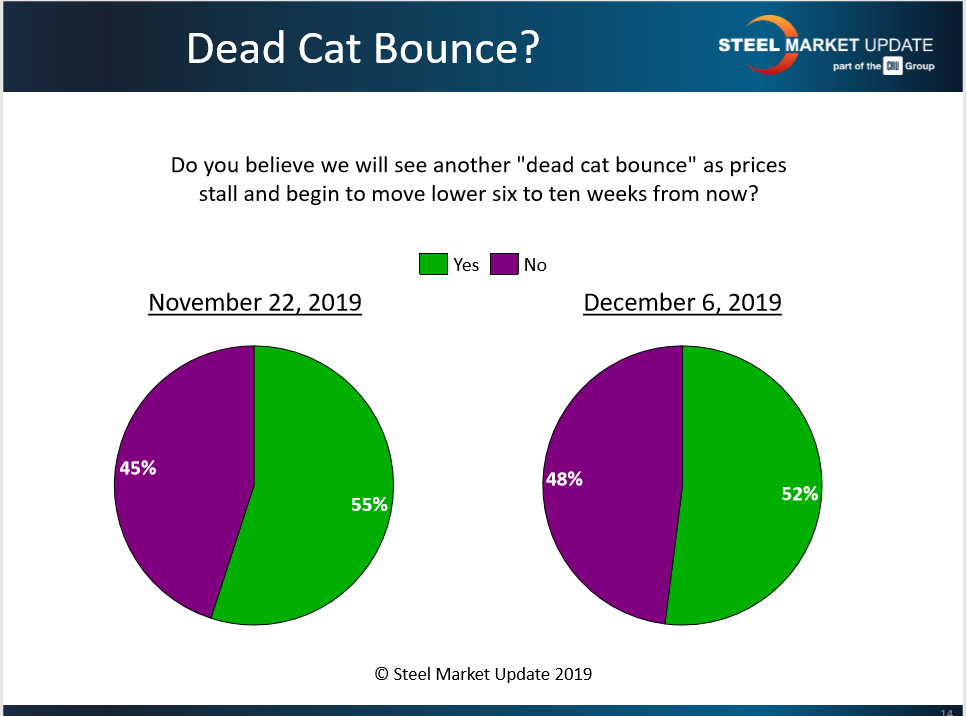 Steel buyers are almost evenly split on the staying power of the recent price hikes. A slight majority (52 percent) of those responding to SMU’s questionnaire this week said they expect to see another “dead cat bounce” as prices stall and begin to move lower in the next six to 10 weeks.