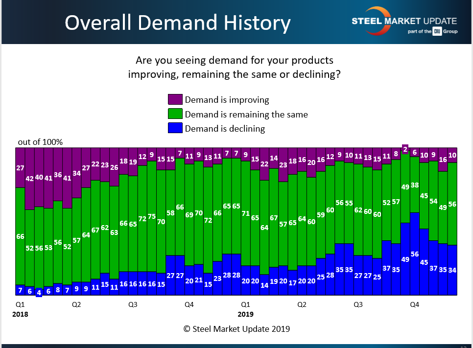 Ultimately, mills can only collect higher prices over the long term if there is sufficient demand. Most buyers (56 percent) report flat demand in the current market. Another 34 percent see demand declining. Only 10 percent see demand improving, which may not bode well for steel prices.