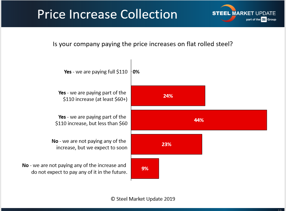 That figure appears a bit high based on the responses SMU received from service centers and manufacturers. Less than one-quarter (24 percent) of the buyers responding to SMU’s questionnaire this week said they are paying an additional $60 or more for steel. The biggest group of respondents (44 percent) said they are now paying more, but less than $60 of the $110 increase. The remaining one-third (32 percent) said they are not yet paying higher prices, and many don’t expect to in the future. No buyers reported paying the entire price increase.