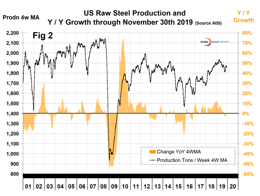 In our SMU reports, we aim to provide information on the same subject from different sources. The data in Figure 1 compares quite well with the AISI weekly crude steel production shown in Figure 2. One is in dollars and the other in tons, but the shape of the curves is comparable. The AISI weekly tonnage had a recent bottom in w/e Oct. 5 on a four-week moving average basis as shown in Figure 2 and is current as of Nov. 30. The other data in this report is through October and is for steel products, not raw steel. We can expect the Commerce data to show an improvement in the next couple of months.