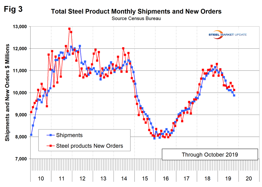 Census Bureau results for August were released on Dec. 4. Figure 1 shows monthly steel product shipments in millions of dollars since 1992 with the year-over-year growth. Shipments peaked last November and have since declined every month. The year-over-year growth rate has declined from 18.6 percent in August last year to negative 10.7 percent in October 2019. The Census Bureau defines shipments as follows: “Manufacturers’ shipments measure the dollar value of products sold by manufacturing establishments and are based on net selling values, f.o.b. (free on board) plant, after discounts and allowances are excluded. Freight charges and excise taxes are excluded. Multi-industry companies report value information for each industry category as if it were a separate economic unit. Thus, products transferred from one plant to another are valued at their full economic value.”