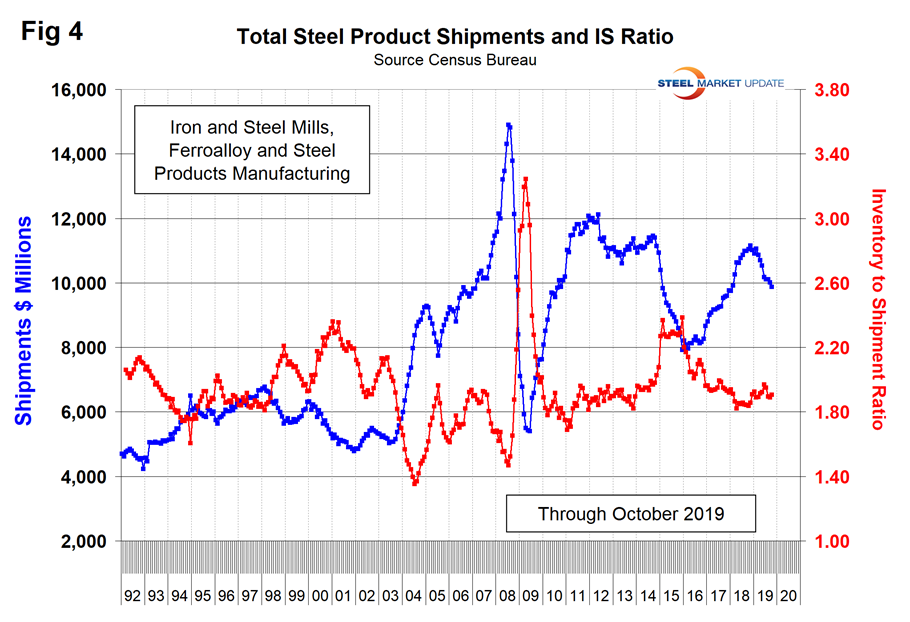 Figure 4 shows the same total shipment line as Figure 1, but now includes the inventory-to-shipment ratio. The IS ratio increased for over a year, but decreased slightly in the months August through October.