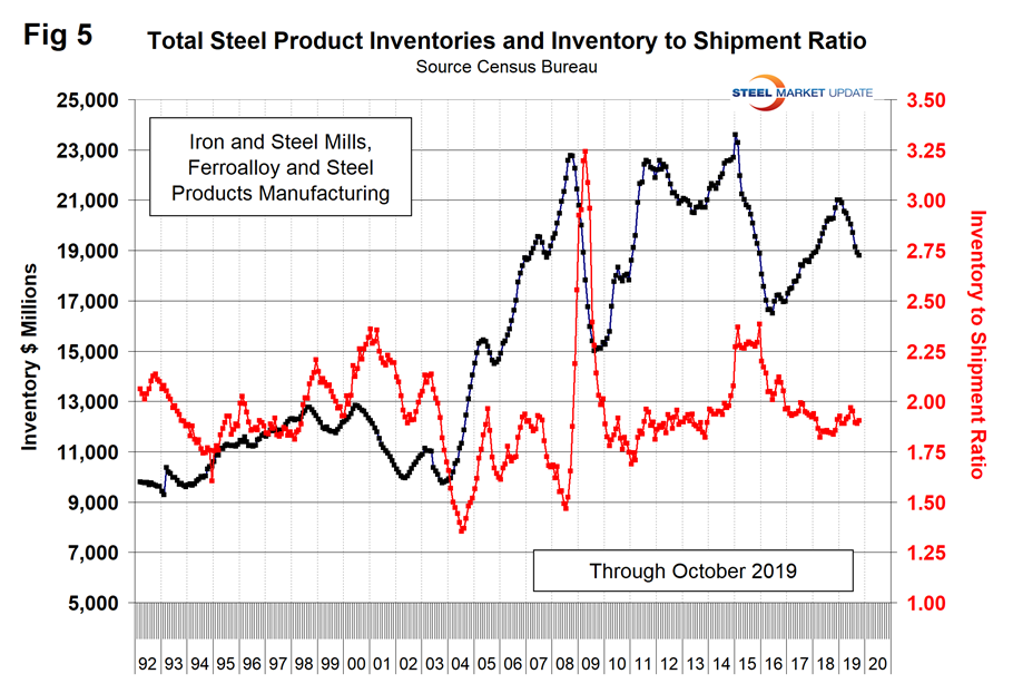 Figure 5 shows total inventory in millions of dollars and repeats the inventory-to-shipment ratio shown in Figure 4. Inventories have declined in parallel with shipments.