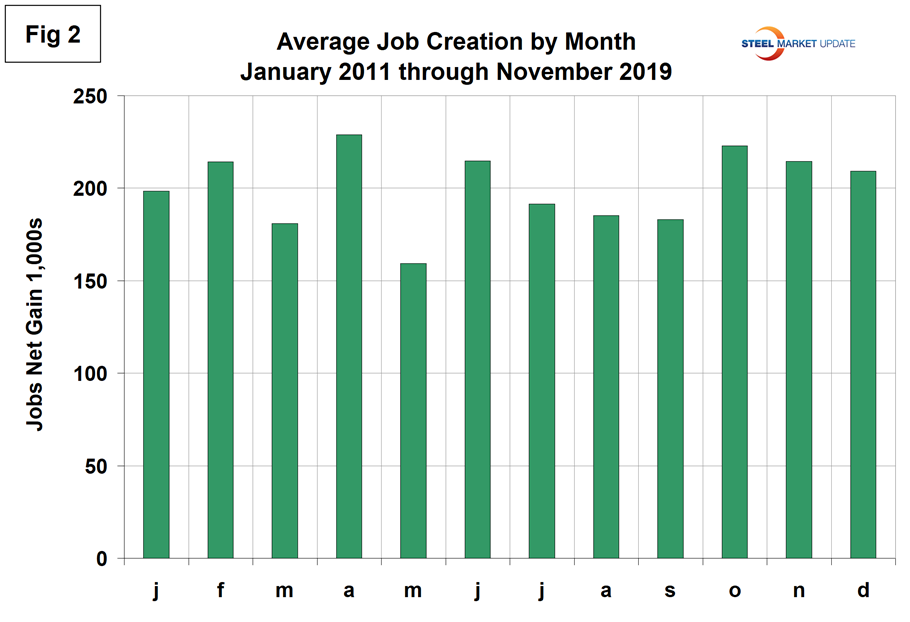 The employment data has been seasonally adjusted. We have developed Figure 2 to examine if any seasonality is left in the data after adjustment. We think it’s significant to look at the results this way because there is so much variability in the numbers that a long term context is necessary, and it doesn’t look as though the BLS seasonal adjustment is very effective. In the nine years since and including 2011, the average month-on-month change from October to November has been negative 4.0 percent. This year the change was positive 71 percent. Without the GM effect the gain would have been positive 44 percent, therefore November was historically excellent.