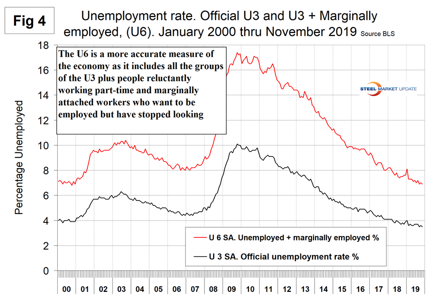 The official unemployment rate, U3, reported in the BLS Household survey (see explanation below) declined from 3.7 percent in June, July and August to 3.5 percent in November. U3 has ranged from 3.5 to 4.0 percent in each of the last 17 months. This is not a very representative number. The more comprehensive U6 unemployment rate at 6.9 percent was down from 8.1 percent in January (Figure 4). The difference between these two measures in November was 3.4 percent, which is historically excellent and the lowest since August 2001. U6 includes individuals working part time who desire full-time work and those who want to work but are so discouraged they have stopped looking.