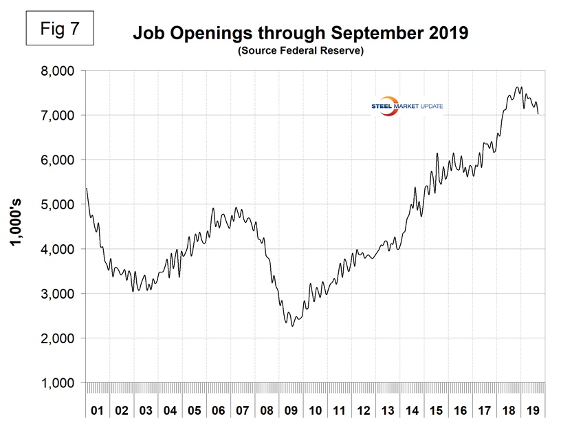 The job openings report known as JOLTS is reported on about the 10th of the month by the Federal Reserve and is over a month in arrears. In the November employment report, JOLTS data was reported for September. Figure 7 shows the history of unfilled jobs. In September, openings stood at 7,024,000, which was still historically high but down from 7,626,000 in November 2018. There are still more job openings than there are people counted as unemployed.