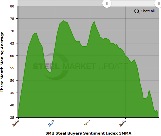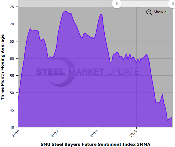 SMU Steel Buyers Sentiment Index is a measurement of the current attitude of buyers and sellers of flat rolled steel products in North America regarding how they feel about their company’s opportunity for success in today’s market. It is a proprietary product developed by Steel Market Update for the North American steel industry.