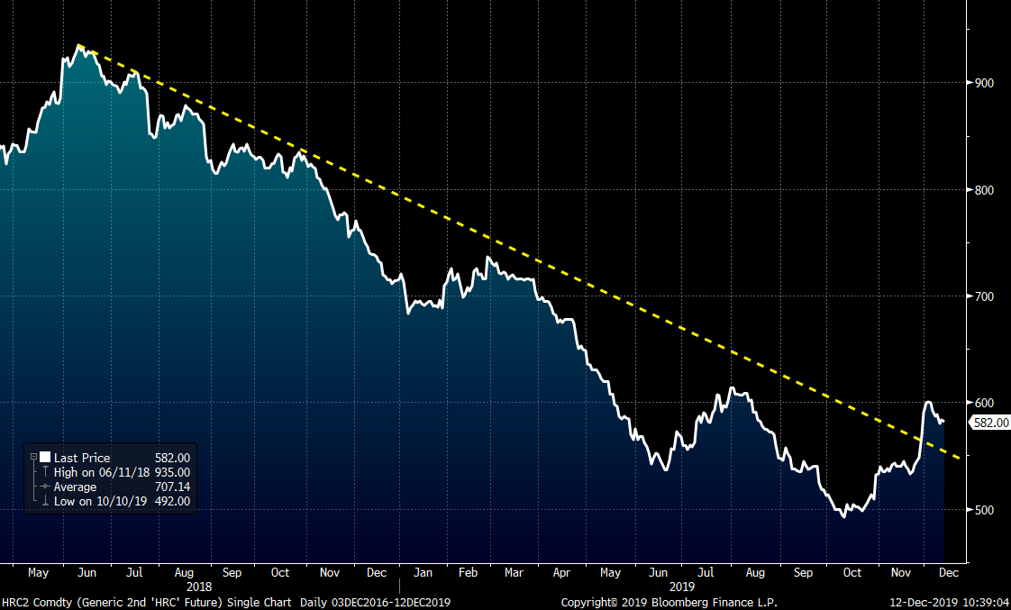 The bear market that started in July 2018 is over. I use July 2018 as the start of the bear market only in retrospect because at the time, flat rolled markets were unknowingly coming to the end of one of the longest and most explosive rallies in Midwest HRC history. What looks to be occurring now is a shift from the brutally long 16-month bear market to a nascent bull market with the low set in mid-October at $492 on the rolling 2nd month CME Midwest HRC future.