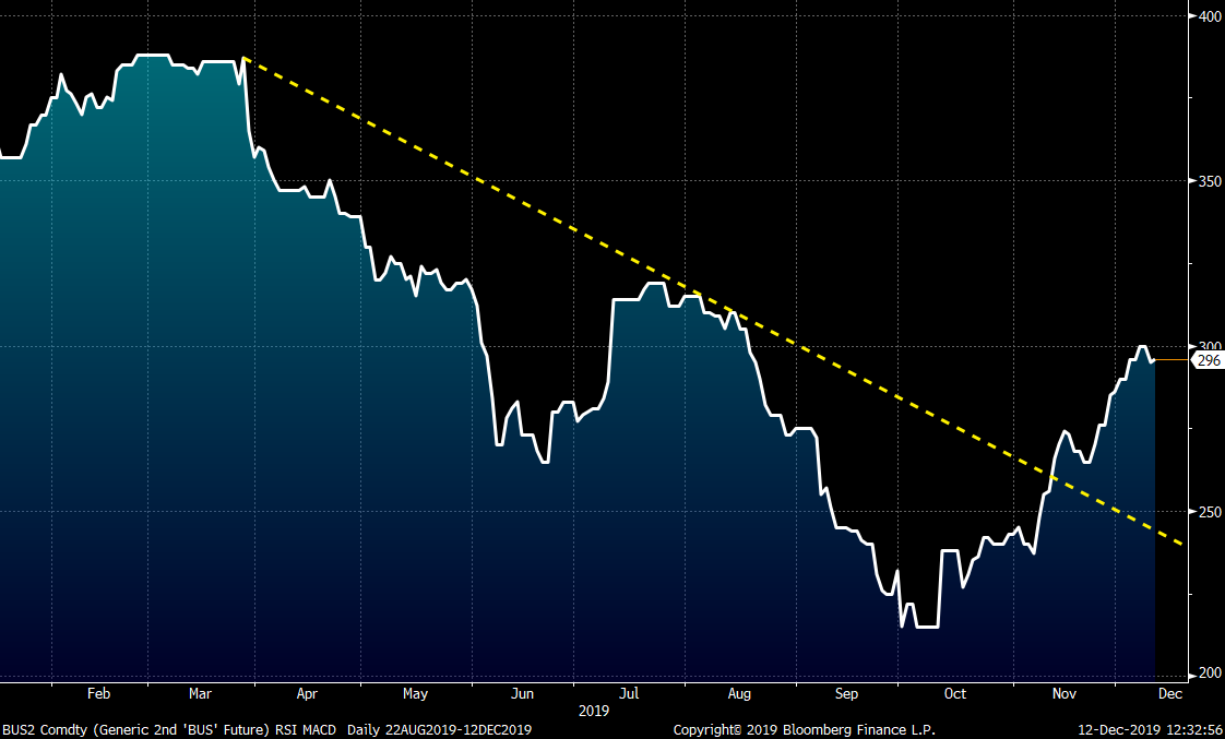 Rolling 2nd month busheling futures now (February) have also participated in the rally from the lows, breaking above their downtrend while trading as high as $300 last week.