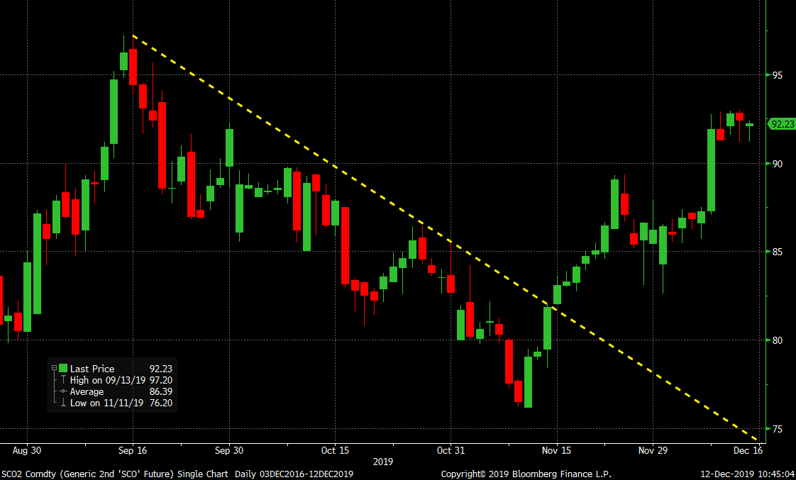Iron ore was the first product to break through its downtrend and it broke above it with authority. This is a candlestick chart of the rolling 2nd month SGX iron ore future. Candlestick charts show the opening and closing prices. If the “candle’s” color is green, it means it closed above where it opened (strength). If it is red, it means it closed below where it opened (weakness). On Nov. 12, it opened at $76.20 and then made a higher high for 10 consecutive days to close at $86.30 on Nov. 25. The price action in ore has been the kind you see in a bull market. Large up days accompanied by quiet, flat and down days.