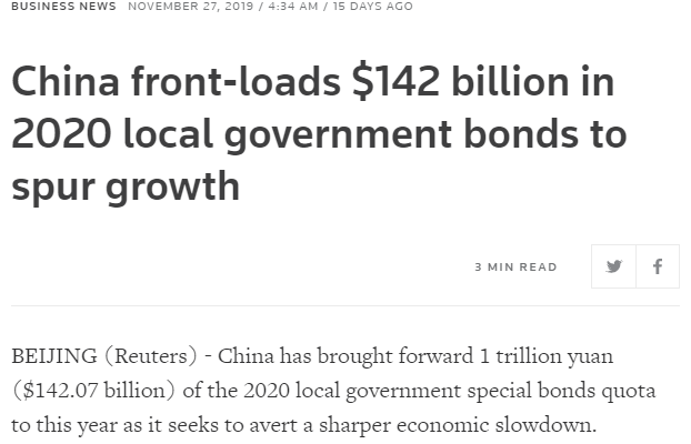 On the day before Thanksgiving, China announced it had brought forward $142 billion of 2020 spending into Q4 to stimulate the economy. China is fighting the trade war with their bread and butter play; infrastructure spending. What’s interesting about $142 billion is it is equal to one trillion yuan, and one trillion yuan is just as much a message as anything else. An old and favorite tactic of the Chinese, the government is sending a signal that there will be more spending to encourage speculation. [ARTICLE CONTINUES BELOW]