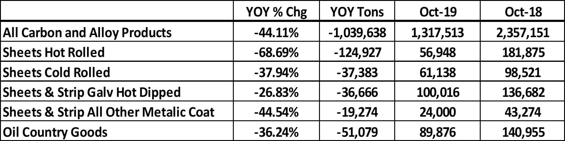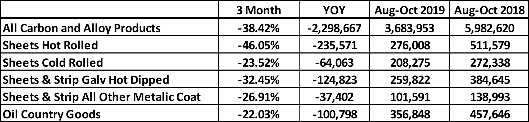 This table adds the three months from August through October. HR + CR + HDG + AZ/AL total a 462k ton year-over-year decrease over the same three-month period; annualized they total over 1.8m, close to the capacity of Big River (1.5m), Gallatin (1.6m) and North Star BlueScope (2.1m). Consider the effect of one of those mills being shut down.