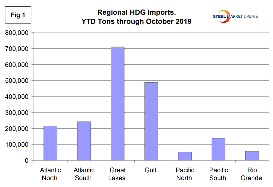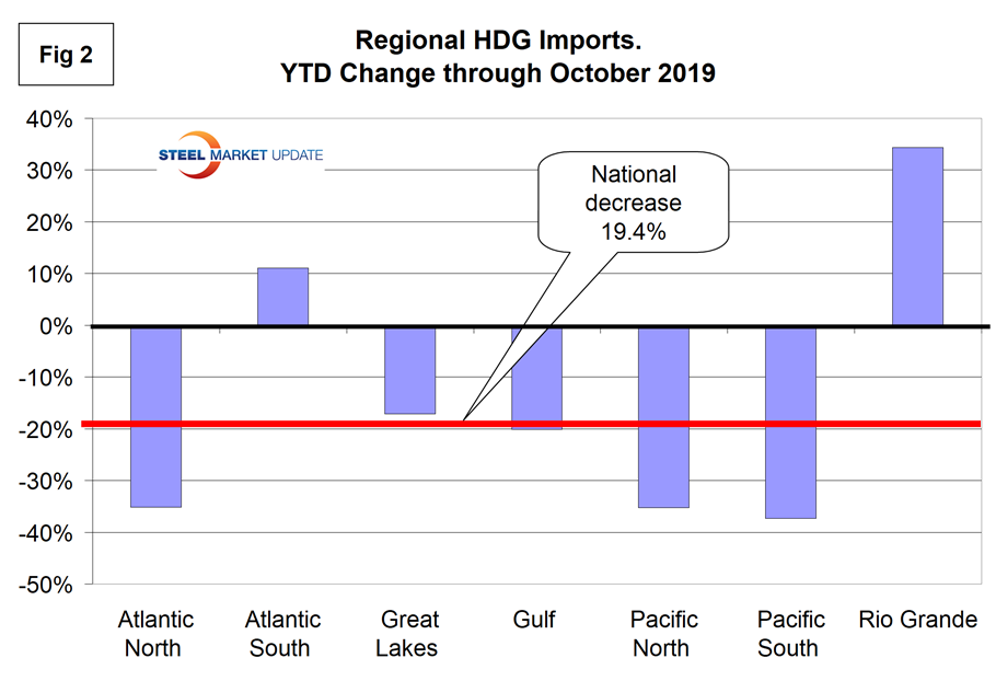 Year to date through October, total hot-dipped galvanized sheet imports were down by 19.4 percent and decreased in all regions except the Atlantic South and the Rio Grande. The Atlantic North was down by 35.1 percent and the Rio Grande was up by 34.4 percent.