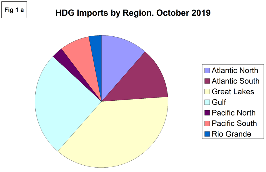 This month, we are reporting through October. These six reports are intended to be reference documents with very few specific comments. The charts tell the whole story. Our intent is to provide buyers and sellers with an understanding of what is going on in their region of operation. Figure 1 shows the year-to-date tonnage into each region and the huge variation between them. Figure 1a presents the same data as a pie chart. By far the highest volume region in 2019 YTD October was the Great Lakes. The Pacific North and Rio Grande received minimal tonnage.