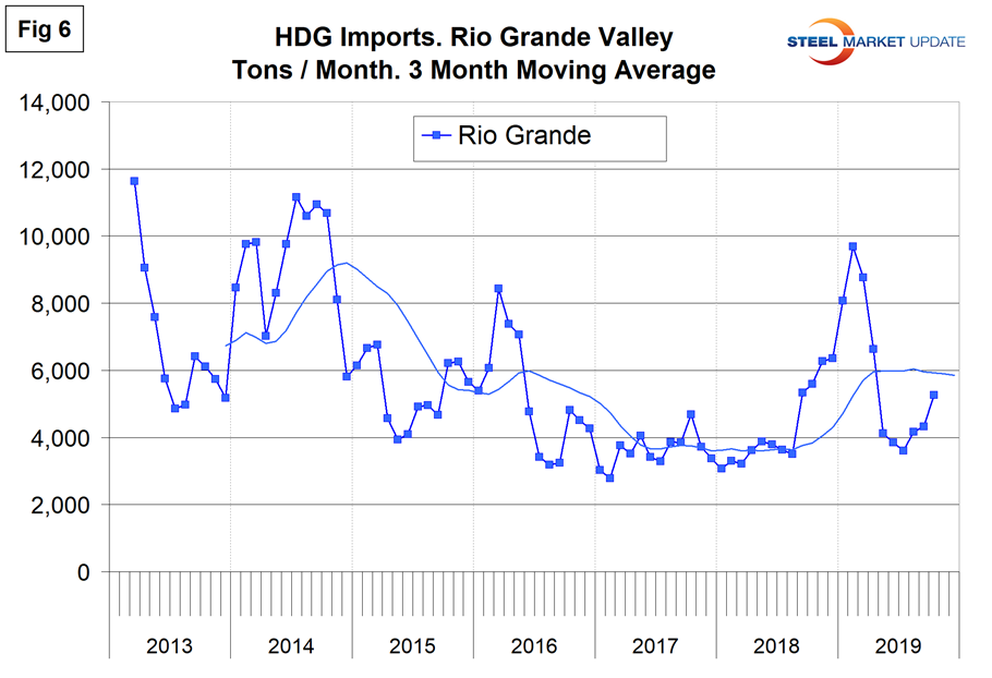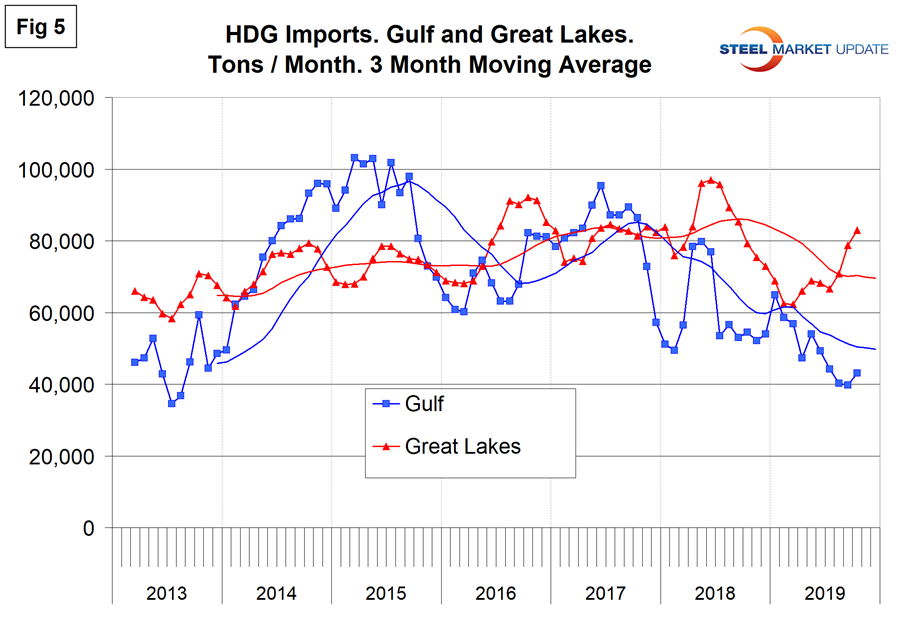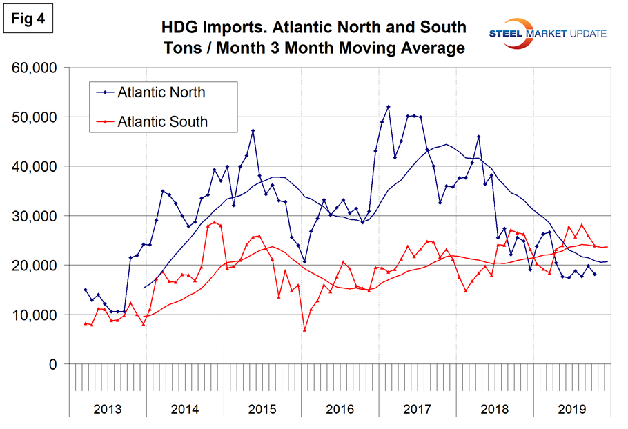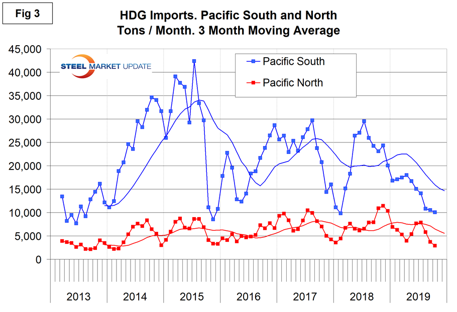 Figures 3, 4, 5 and 6 show the history of hot-dipped galvanized imports by region since March 2013 on a three-month moving average basis. Note, the Y axis scales are not the same.