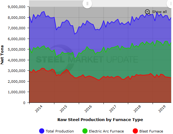 Broken down by production method, 5,657,855 tons (70.8 percent) were produced by electric arc furnaces (EAFs) and 2,333,538 tons (29.2 percent) were produced by blast furnaces. While the October EAF production level is not record breaking, the percentage of steel produced by EAFs in relation to total monthly production is at the highest level seen in our ~10-year limited history, surpassing the October 2017 high of 70.7 percent.