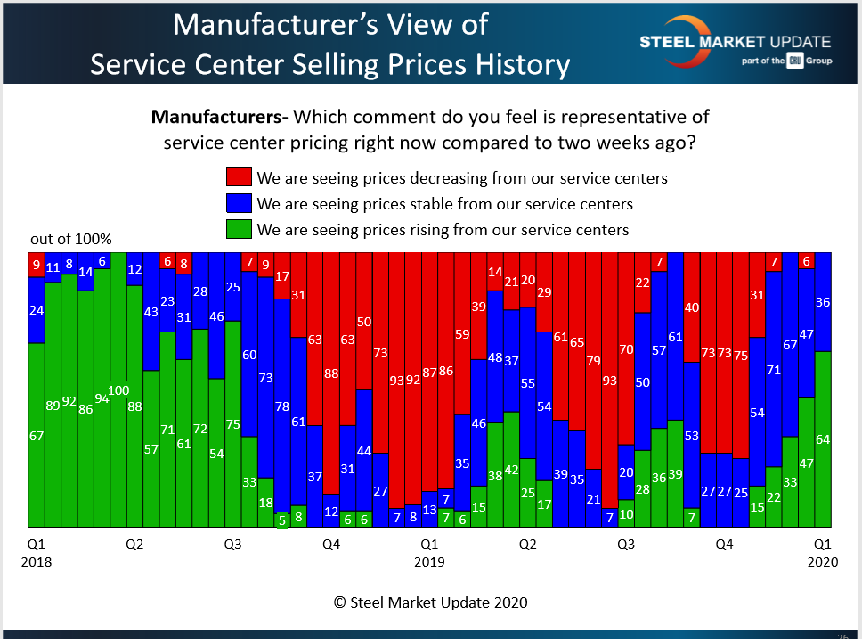 Considering prices from the manufacturer’s point of view confirms the trend. Sixty-four percent of the OEMs and fabricators responding to SMU’s survey Jan. 6 said they were still seeing higher prices from their service center suppliers. None reported a price decrease.
