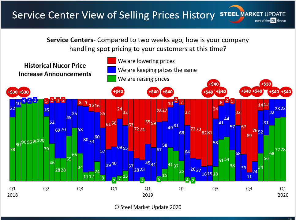 Looking at the charts, the red bars at the beginning of Q4, at 75 percent or more, clearly show the point of capitulation—the point at which steel prices had gotten so low that service centers were more concerned about their inventories than their sales.