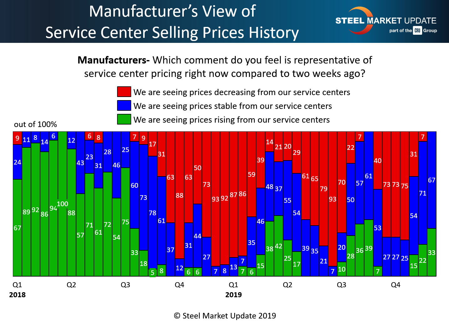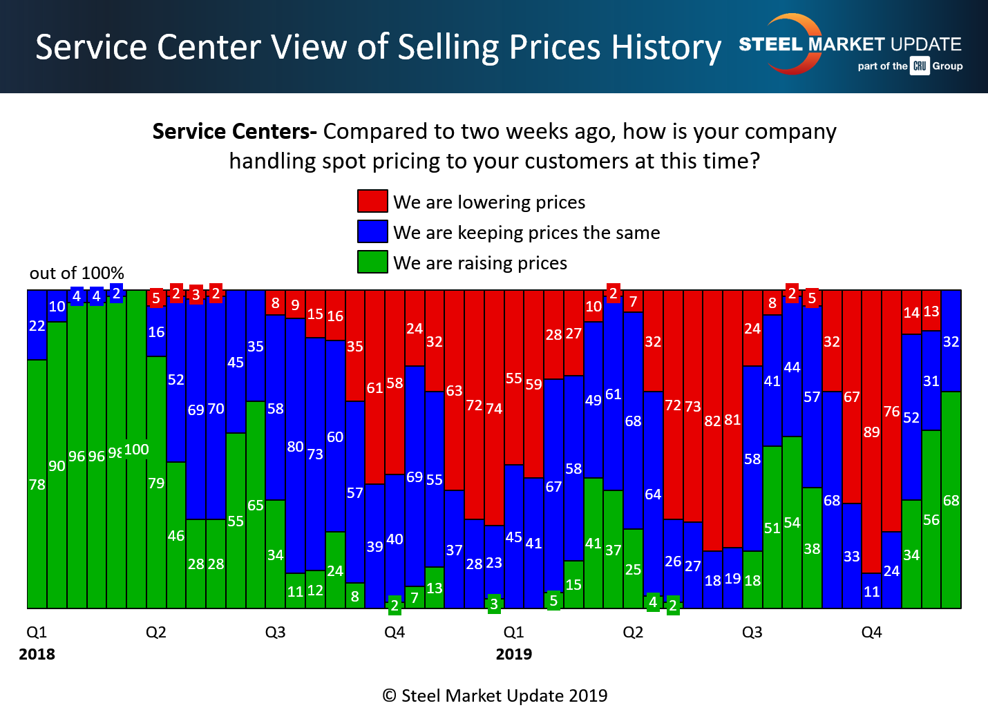 A higher percentage of steel distributors responding to our flat rolled and plate steel market trends questionnaire reported flat rolled spot prices as being increases compared to where they were two weeks ago (remember, this survey was completed on the 8th of December and we have another survey in process this week). We saw 68 percent of those responding to this question reporting moving spot prices higher. This is up from 56 percent measured during the middle of November, and is the highest level seen since early second-quarter 2018.