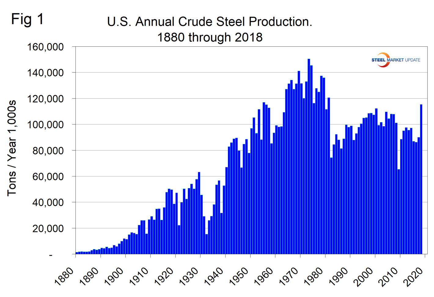 Steel production in the U.S. in 2018 was the highest since 1981, according to the World Steel Association, which released its statistical yearbook for 2018 on Dec. 16. Crude steel production in the U.S. hit 115,386,000 metric tons last year, the highest output in 37 years and the first year to exceed 100 million metric tons since 2008.
