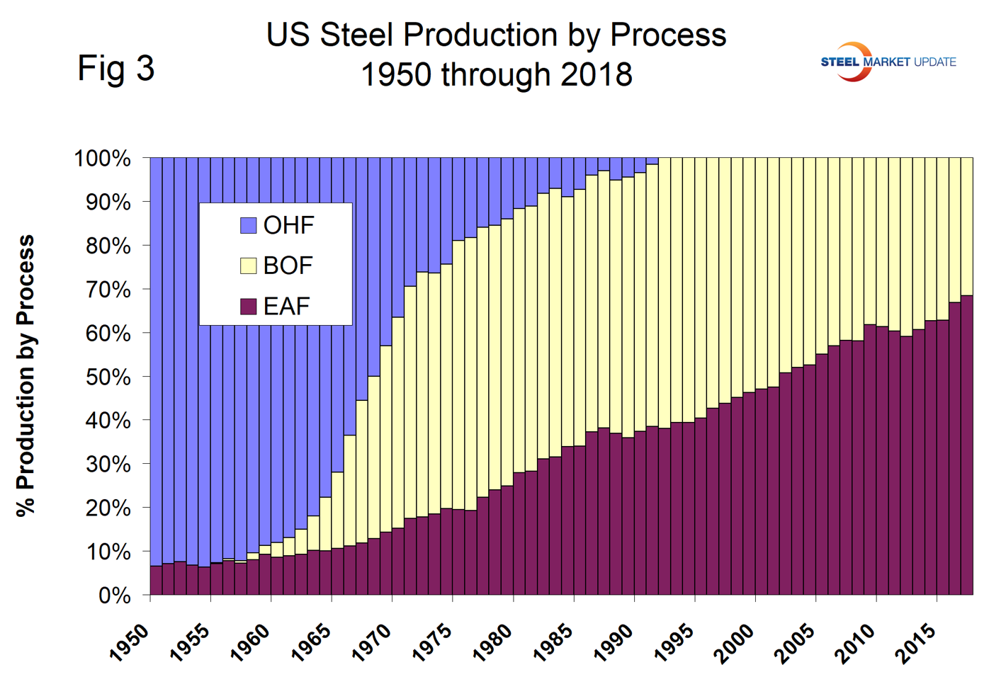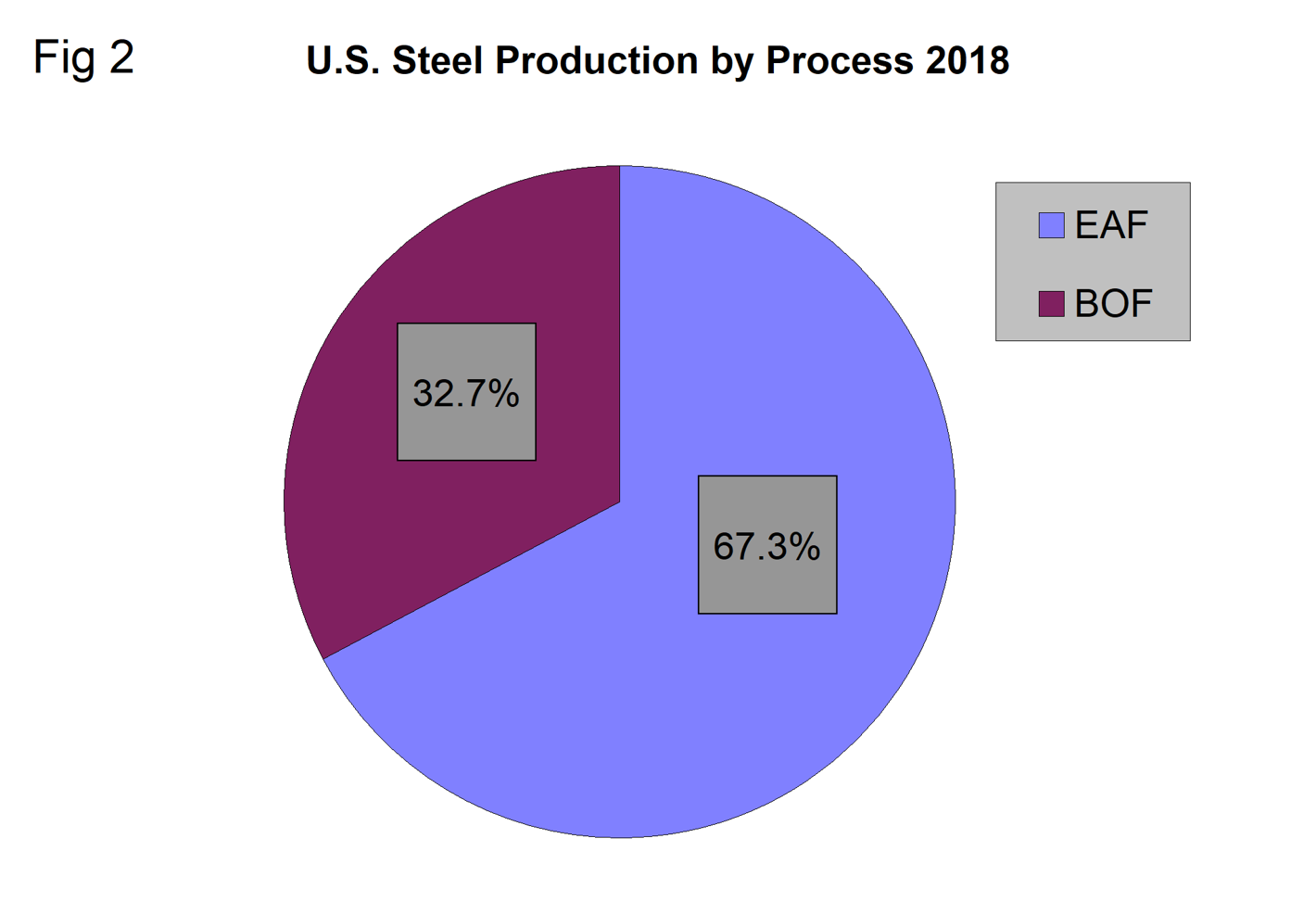 Minimills produced about two-thirds of the steel in 2018 as the electric arc furnace process continued to gain greater market share over basic oxygen furnaces. Last year, 67.3 percent of U.S. steel production was by the EAF process and 32.7 percent by the BOF (Figure 2).