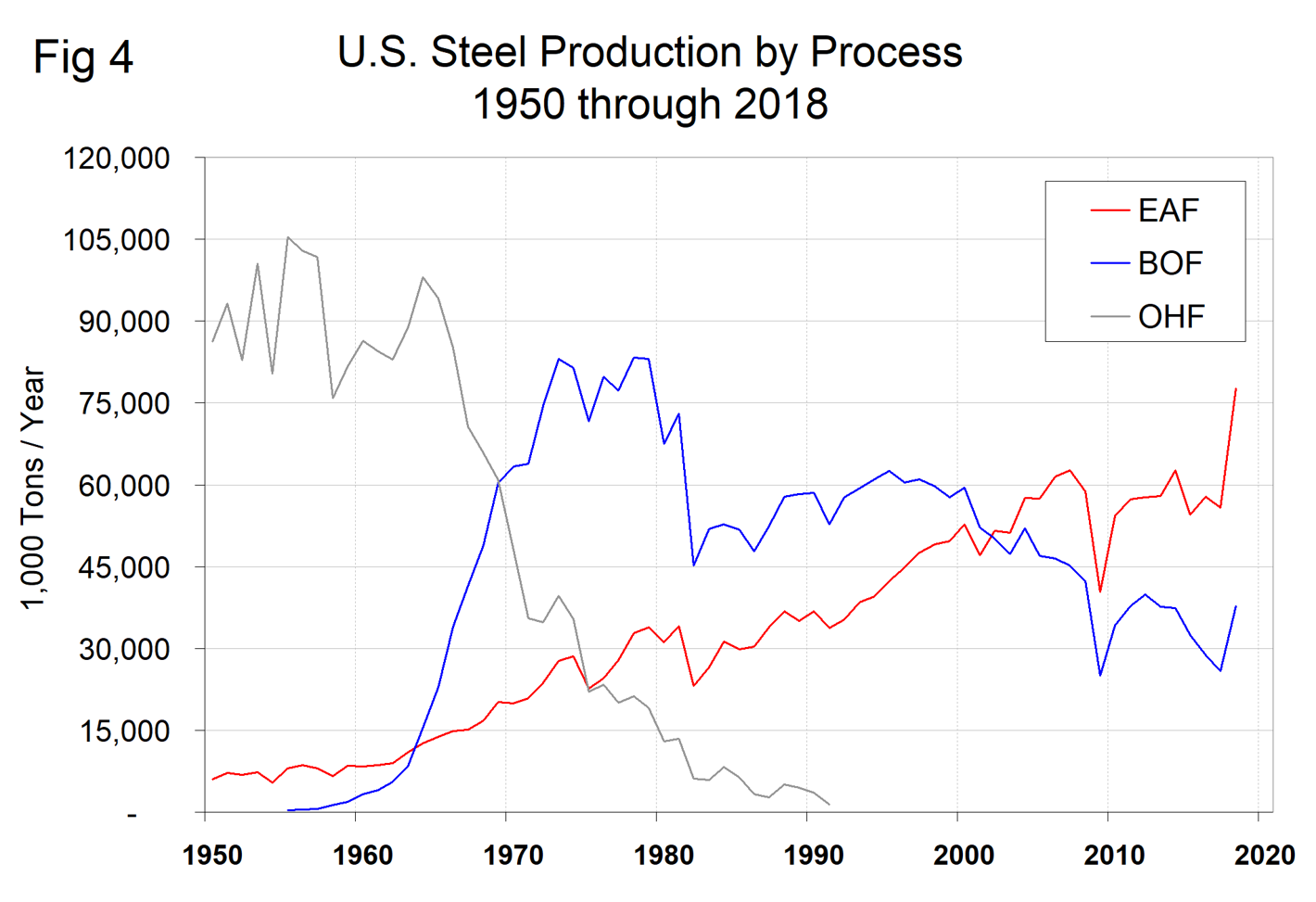 Looking back at history, 1955 was the first year for steel to be produced using the basic oxygen process. This was such a revolutionary improvement in energy efficiency and productivity that in the subsequent 36 years the BOF completely replaced the open hearth process as a producer of commercial steel products. In the U.S., 1991 was the last year for steel to be produced in an open hearth (Figure 3).