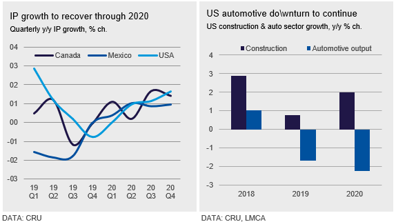 The North American market (U.S., Canada and Mexico) accounts for approximately 9.6 percent of global refined zinc demand. This year, we have seen a sharp slowdown in both global trade and industrial production, with the North American region experiencing its slowest rate of IP growth since 2016. On a country-by-country basis, Mexico has seen the greatest degree of economic and industrial weakness in 2019, with the U.S. and Canada continuing to see modest rates of growth. Despite domestic frictions impacting North American trade of steel and other metals due to Section 232 and retaliatory tariffs in the opening few months of this year, we estimate that refined demand has remained broadly stable, declining just 0.2 percent y/y in 2019. The weakest North American end-use demand sector throughout 2019 has been automotive, while construction-related activity has remained supportive.