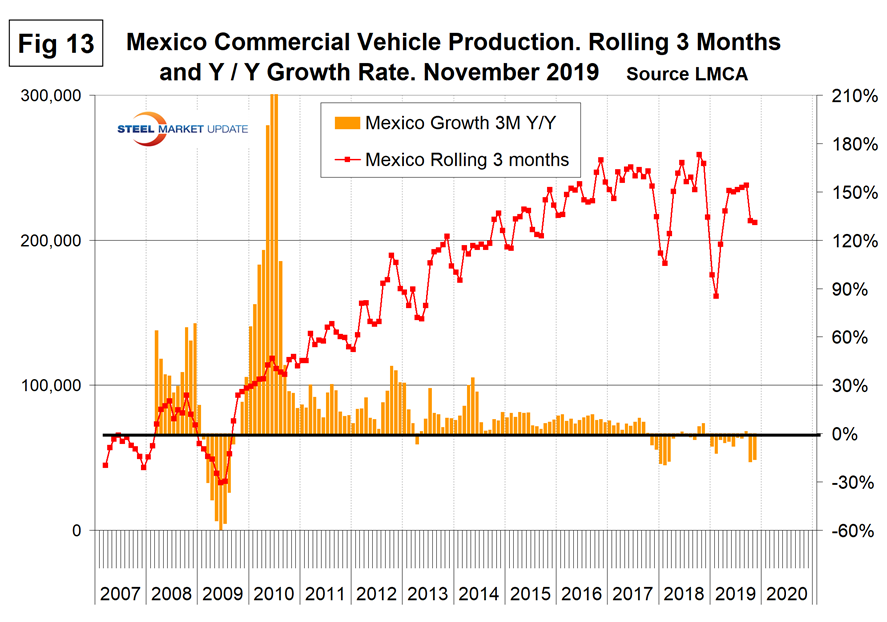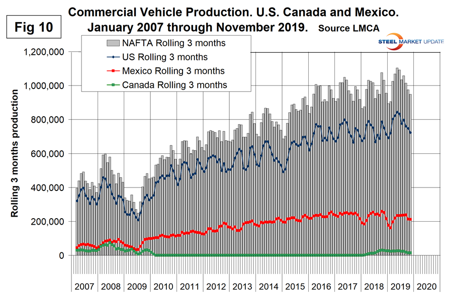 Figure 10 shows the total commercial vehicle production for North America and the total for each nation. The U.S. has held its ground much better in commercial vehicles than in the personal segment.