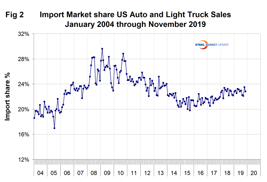 Figure 1 shows auto and light truck sales since January 2004. In November, total sales were down by 2.9 percent on a three-month moving average (3MMA) basis year over year. Light trucks that include pickups, SUVs and crossovers have been surging at the expense of cars for four years. In November, the mix was 72.5 percent light trucks and 27.5 percent autos. In 2019, import market share had a high of 23.5 percent in October and declined to 22.8 percent in November as shown in Figure 2.