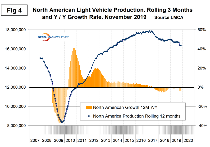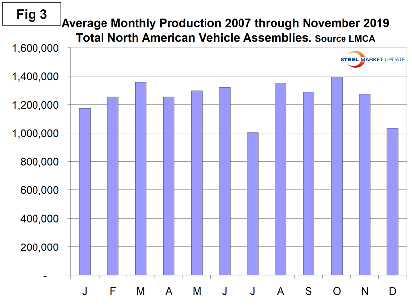 The United Auto Workers strike against General Motors began on Sept. 16 and lasted for 40 days, affecting more than 48,000 workers. By the beginning of November, all these people has been re-employed. The strike closed 34 GM plants across the U.S., forced suppliers to idle workers and disrupted operations in Mexico and Canada. Total light vehicle (LV) production in North America in November was at an annual rate of 17.2 million units, up from 15.1 million in October. On average since 2007, November’s production has been down by 8.7 percent from October. This year production was up by 14.2 percent as plants came back on stream. Figure 3 illustrates the seasonality of production on average since January 2007. On a rolling 12-months basis, total North American assemblies were down by 3.6 percent year over year through November. Note that production numbers are not seasonally adjusted; the sales data reported above are seasonally adjusted.