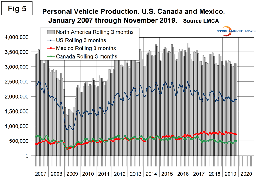 Figure 5 shows the total personal vehicle production for North America and the total for each nation.