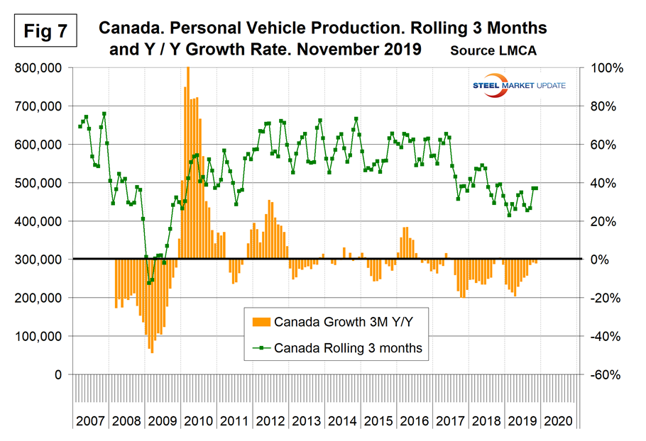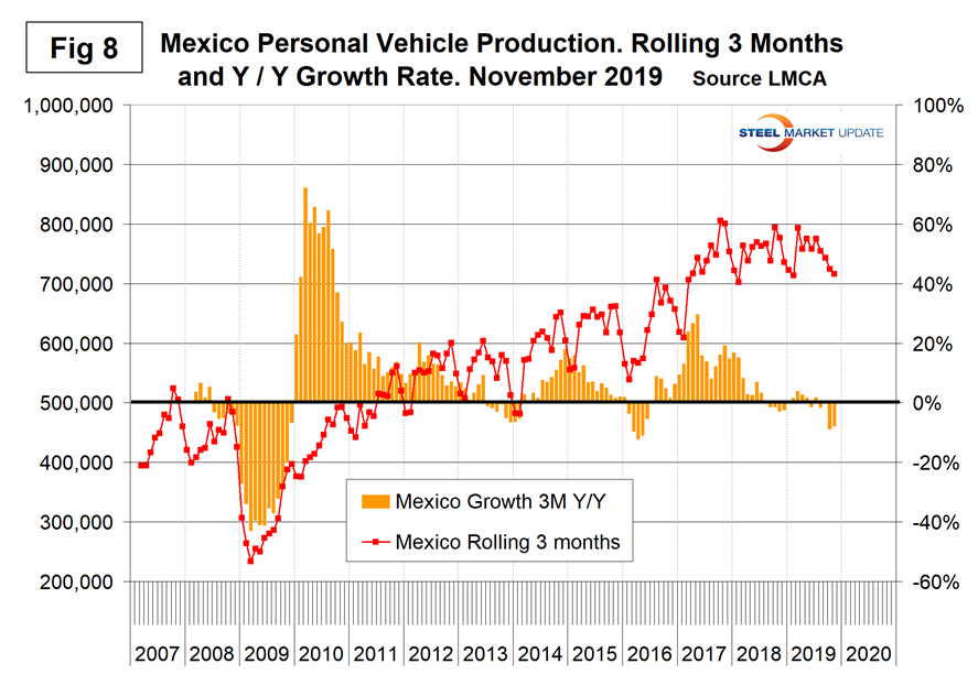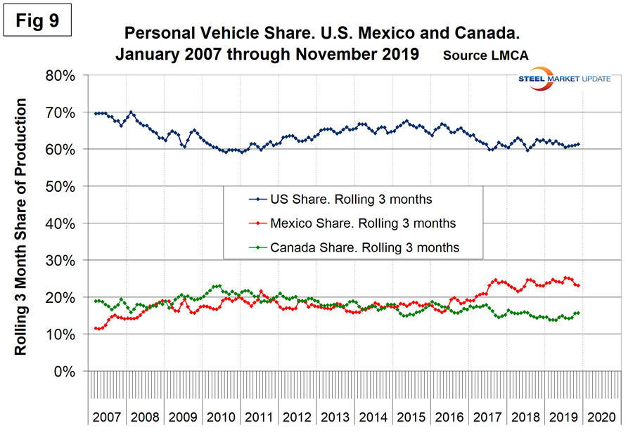 Figures 6, 7 and 8 show the production of personal vehicles by nation and the year-over-year growth rate for each. Figure 9 shows the production share for each nation. Production in the U.S. and Canada has declined since 2015 as Mexico has increased. The Mexican share rose from 17.2 percent in late 2014 to 25.2 percent in July 2019 before falling back to 23.1 percent in November.
