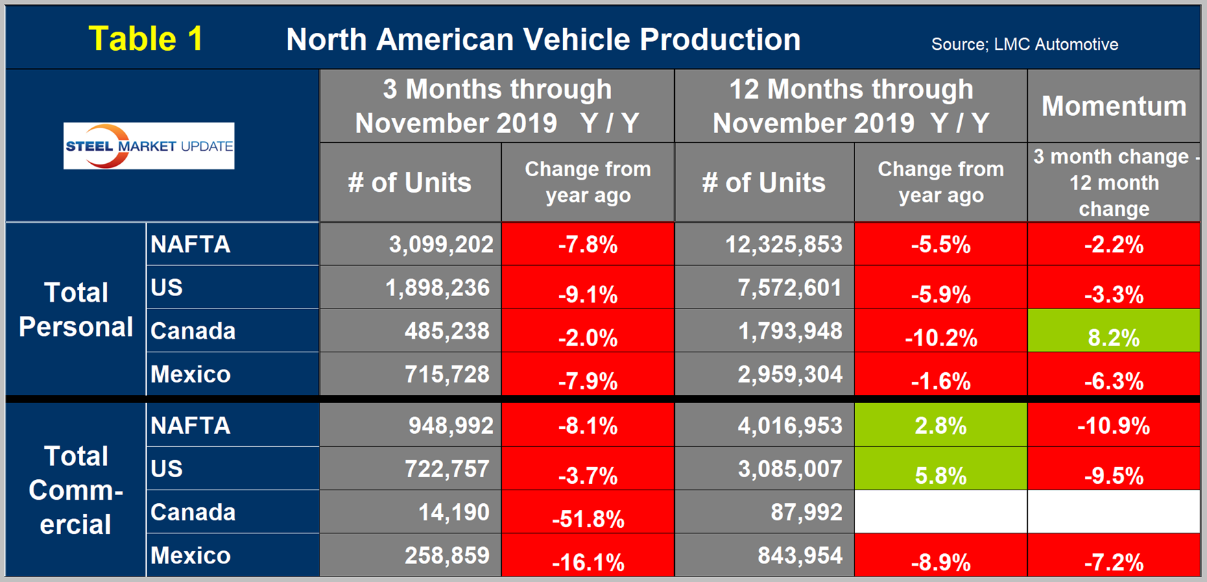 Table 1 is a short-term snapshot of assembly by nation and vehicle type. It breaks down total North American personal and commercial vehicle production into the U.S, Canada and Mexican components and the three- and 12-month growth rate for each. At the far right it shows the momentum for the total and for each of the three nations. In three months through November, assemblies of both personal and commercial vehicles were down in all three nations. We don’t know the magnitude of the strike effect on total assemblies, but as far back as January this year and since then the total of NAFTA assemblies was negative on a 3MMA basis year over year. Note, there are blank cells for Canadian commercial production in Table 1; see explanation below.