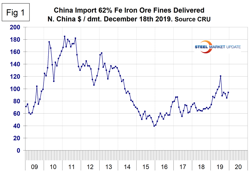 Based on CRU’s data, the weekly average spot price of 62% fines delivered North China was $94.00 per dry metric ton on Dec. 18, up from $85.00 on Nov. 20. Figure 1 shows the price of 62% Fe delivered North China since January 2009. The price of ore is above the $20 range that prior to February 2019 had existed for a year and a half.