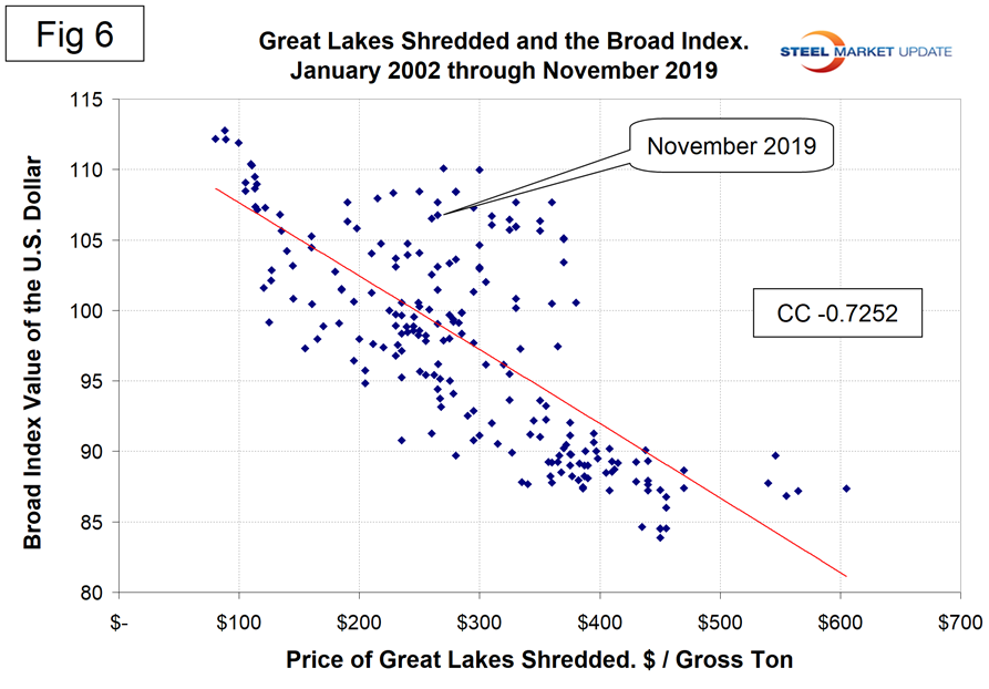 Figure 6 is a scatter gram of the price of Chicago shredded and the monthly Broad Index value of the U.S. dollar as reported by the Federal Reserve. The latest data for the monthly Broad Index was November. This is a causal relationship with a negative correlation of almost 73 percent.