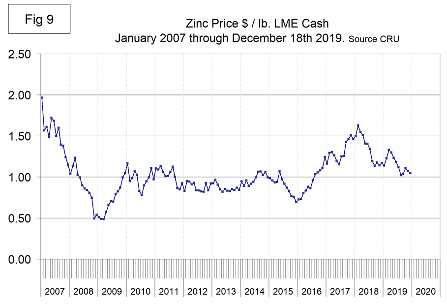 The LME cash price for zinc mid-month is shown in Figure 9. The latest data is for Dec. 18 when the price was $1.05 per pound, down every month from March through August with a small rebound since then.