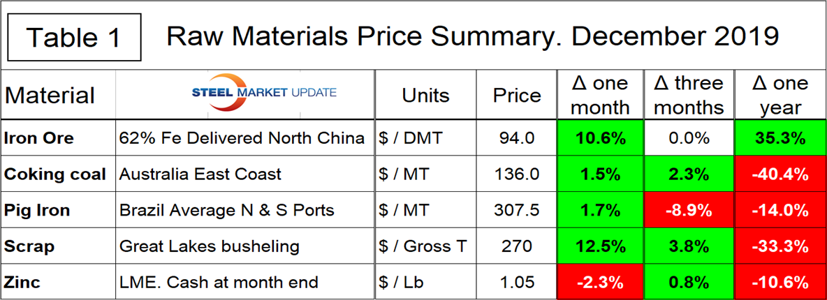 In Steel Market Update’s latest raw materials report, Table 1 summarizes the price changes through Dec. 18 of the five materials considered in this analysis. It reports the month/month, 3 months/3 months and 12 months/12 months changes on a percentage basis. Four of the five materials under consideration had a positive price movement in December. Only zinc continued to decline since our November update.