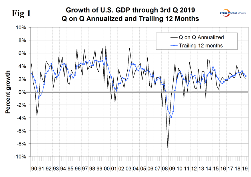 GDP is now measured and reported in chained 2012 dollars, and on an annualized basis in the third quarter totaled $19.121 trillion. The growth calculation is misleading because it takes the quarter-over-quarter change and multiplies by four to get an annualized rate. This makes the high quarters higher and the low quarters lower. Figure 1 clearly shows this effect. The blue line is the trailing 12-months growth and the black line is the headline quarterly result. On a trailing 12-month basis, GDP was up by 2.44 percent in the third quarter, which was down from 3.20 percent in the first quarter. To put that result into perspective, the average in 39 quarters since Q1 2010 has been 2.35 percent. The blue line in Figure 1 shows the progress of the trailing 12-month result since the first quarter of 1990.