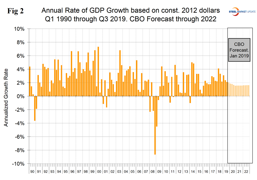 Figure 2 shows the headline quarterly results since 1990 and the January 2019 Congressional Budget Office forecast through 2022. The CBO underestimated the growth rate in the first quarter of 2019, but was correct for the second and third quarters and expects the boost from the tax break to continue to decline in the fourth quarter of 2019.
