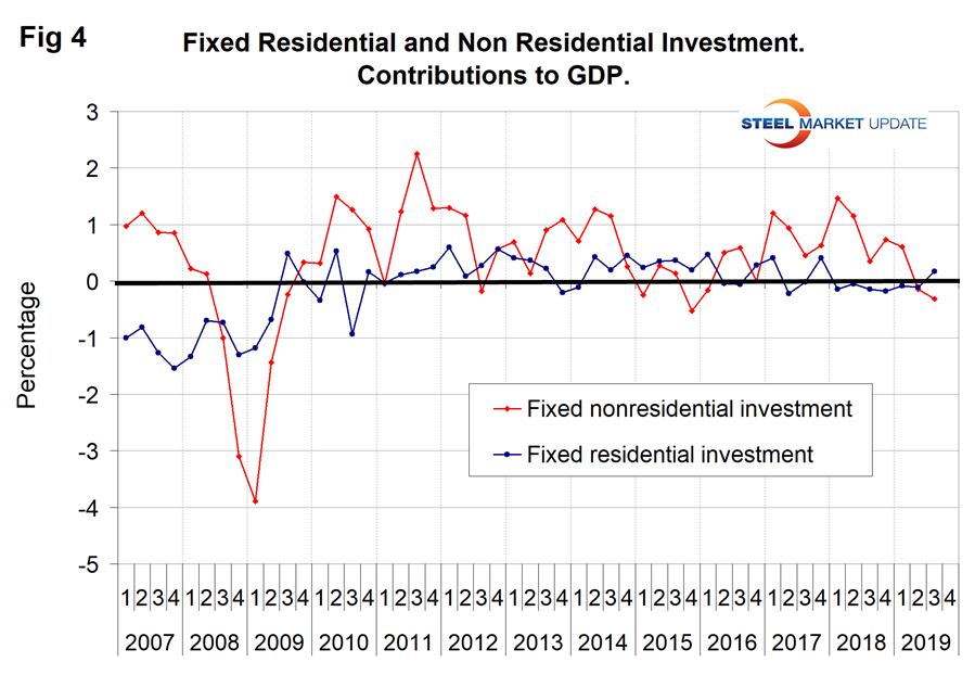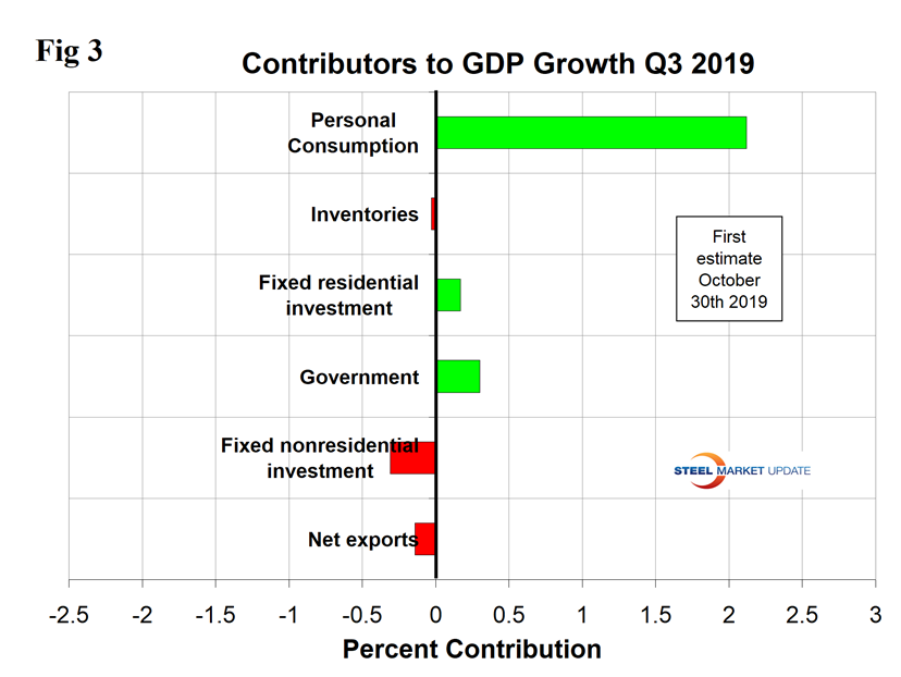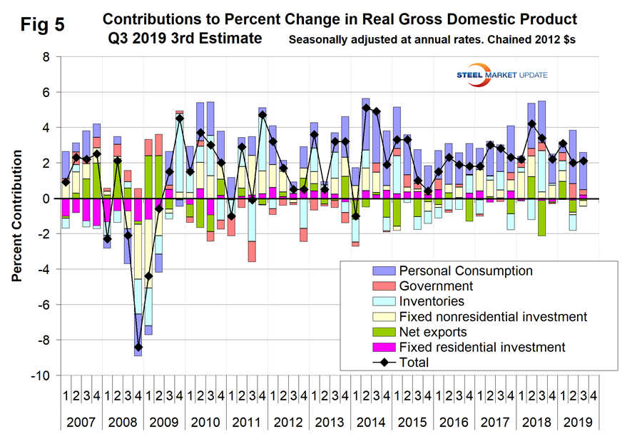 The mix of the six major contributory components in the final GDP growth calculation is shown in Figure 3. Normally, personal consumption is the dominant growth driver and this was the case in the third quarter when this contribution was 2.12 percent. Personal consumption includes goods and services, the goods portion of which includes both durable and non-durables. Fixed nonresidential investment and net exports detracted from the overall result. The effect of inventories is always a wild card in the GDP calculation, but in the third quarter had almost no effect. Declining inventories are entered as a negative in the GDP calculation. Note that in the definitions at the end of this piece, inventories are not mentioned. Over the long run, inventory changes are a wash and simply move the reported growth from one period to another.