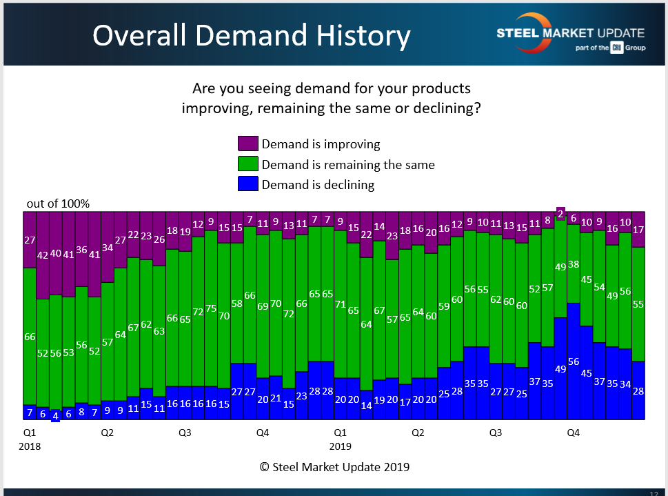 Customer demand for steel is unchanged for the majority (55 percent) of the service center and manufacturing executives who responded to SMU’s questionnaire this week. More report demand on the downturn than on the upswing, which is not a positive for mills looking to collect higher prices. About 28 percent of respondents said demand for their product is declining, while just 17 percent said demand is improving.