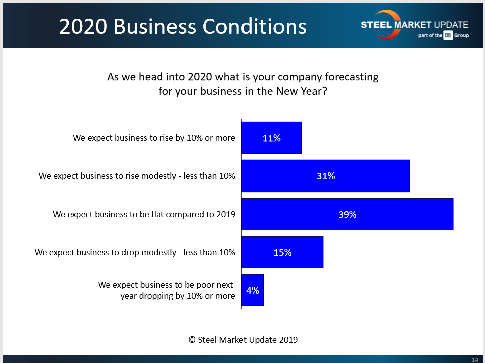 Commented one service center executive: “If the mills would stop this wild and irresponsible pricing rollercoaster and let the market settle, maybe some confidence and credibility—and most importantly profitability—would return to our collective markets.” Expressing some optimism, one service center exec said: “With the new Canada/Mexico deal, the new China deal, and the 2020 Infrastructure spending, we fully expect a better year in steel plate fabrication overall.” But one trader remains guarded: “I hope to be flat, but who really knows. Maybe some small increases as I move onto other products and industries.”