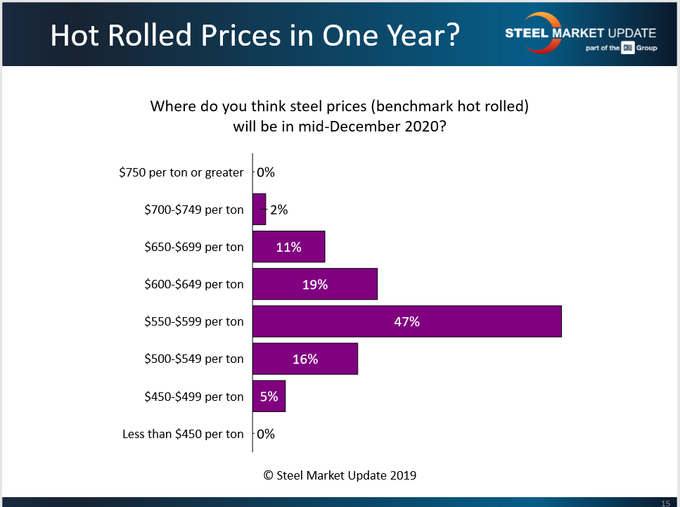 While it’s impossible to predict steel prices a year in advance, the consensus view is for the price to fall in the $550-600 range where it is right now. Only about one-third of the respondents are guessing the HR price will be higher this time next year. Wishful thinking, perhaps?
