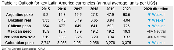 The table below illustrates our outlook for the currencies of the key South American economies covered in CRU’s cost services. As noted above, we expect the ARS to have a difficult time in gaining any ground. That will spill over into Brazil as well, but Brazil could find better export prospects in 2020 to stem further deterioration in the BRL. The CLP should strengthen from current levels if the government is willing to go far enough on its reforms.