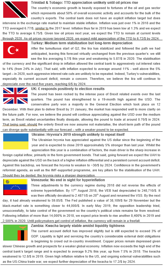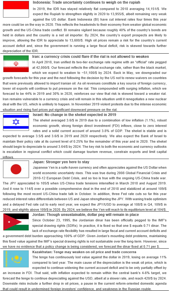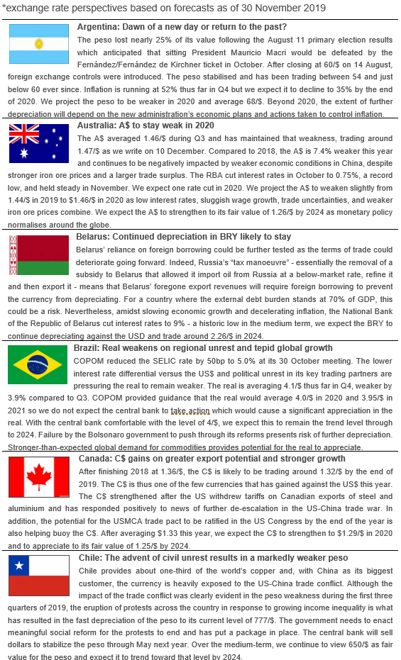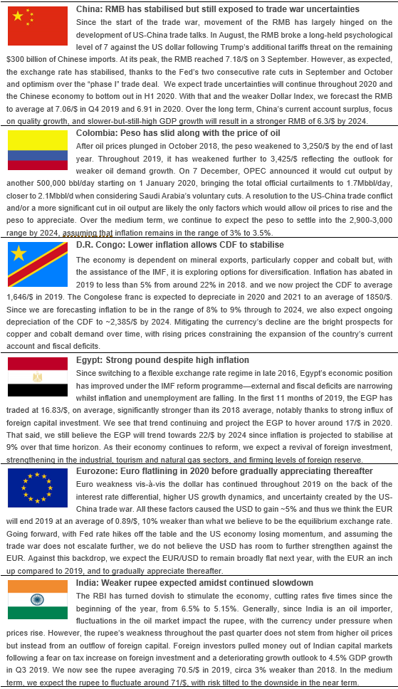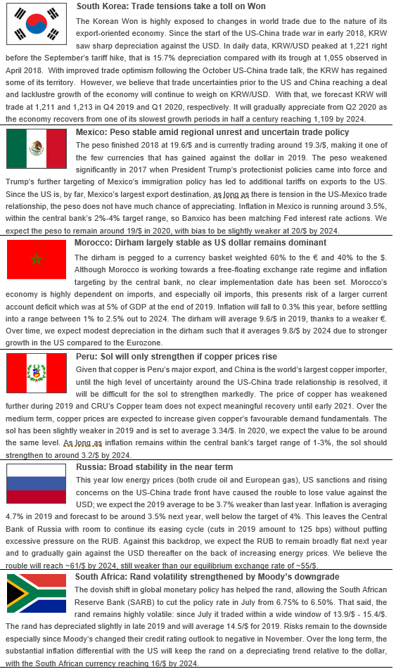 Although weaker demand from China for Chile’s main export, copper, has fed into the CLP’s weakness during 2019, Chile is better placed than others to weather this storm of civil unrest. The ratings agencies are interpreting the protests as a one-off that the government will solve with reforms. A referendum will be held in April 2020 and the outcome will affect the investor outlook for Chile. However, with a two-thirds majority needed to enact major changes, the new Chilean constitution may look very much like the one in existence today. Banco Central do Chile is vigilant on inflation and has announced it will sell dollars to support the CLP through May. Though we expect higher inflation to result from the weaker peso, we do not anticipate inflation will average above 4 percent in 2020. We project the peso to be weaker on average in 2020 compared to 2019, but it should also strengthen from where it sits today.
